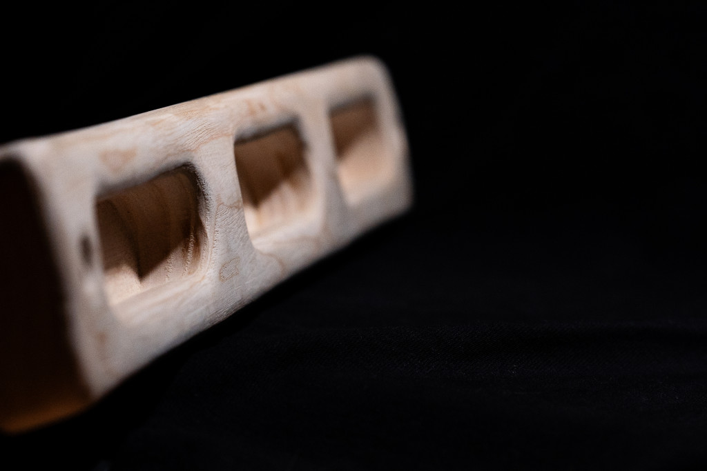 Kőris hangboard, három azonos vájattal, a két szélső két kezes, míg a középső egykezes lógáshoz.